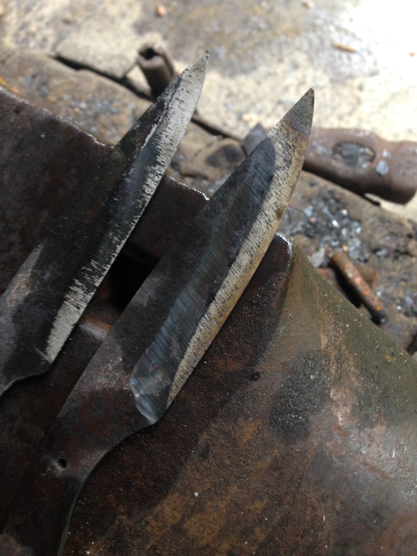 La première … Celle de gauche est très bof … Et retournera au feu car la trempe n’est pas belle et n’a pas bien pris au centre. Par contre la seconde, je la trouve parfaite pour une tortue comme moi…et le revenue résiduelle au feu est réussi . Bref je valide